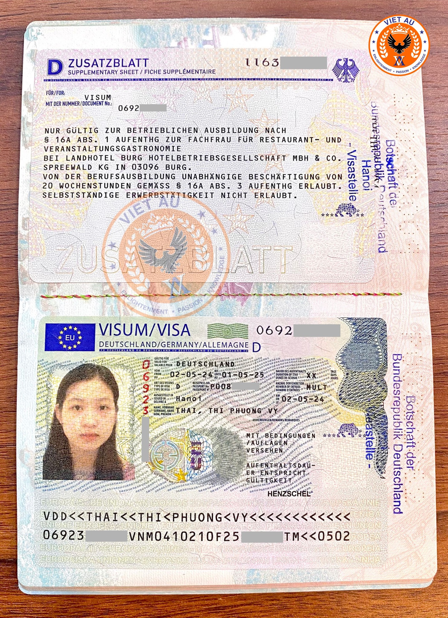 Chúc mừng Thái Thị Phương Vy và Antoni Hoàng đã có visa sang Đức du học nghành khánh sạn. Cảm ơn các em đã đồng hành cùng Việt Âu, chúc các em thành công, gặp nhiều may mắn và nhanh chóng thực hiện được dự định, ước mơ trong tương lai.